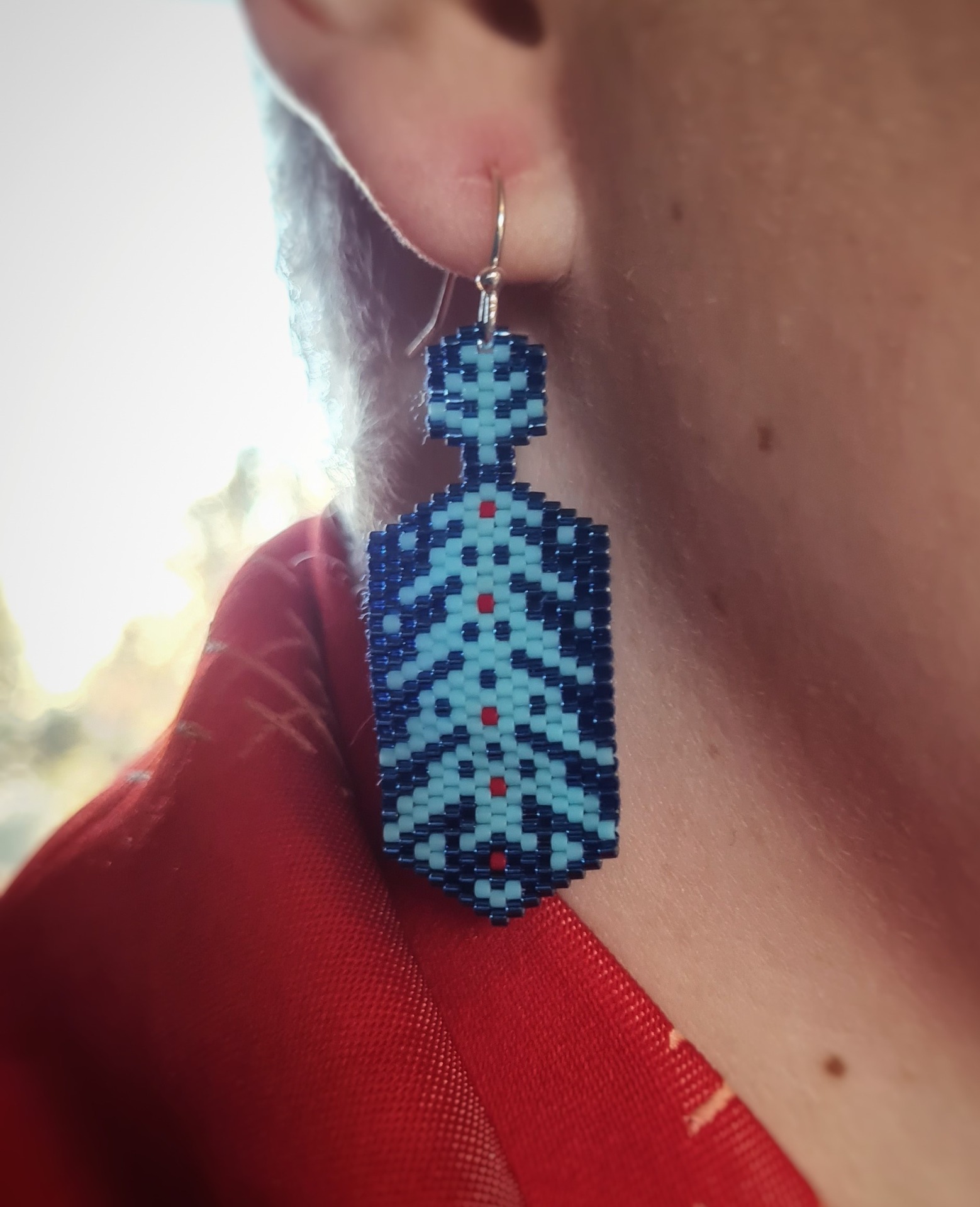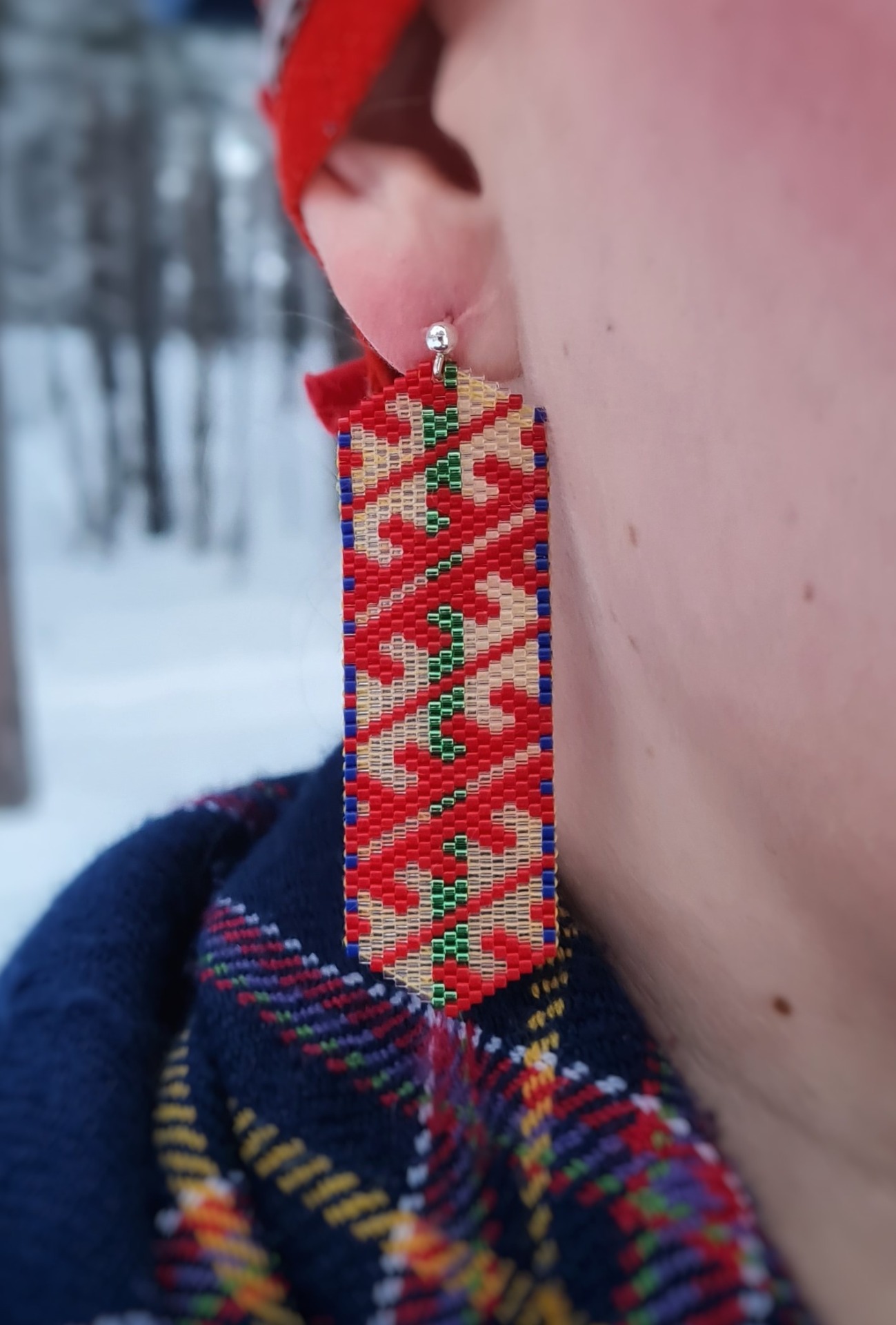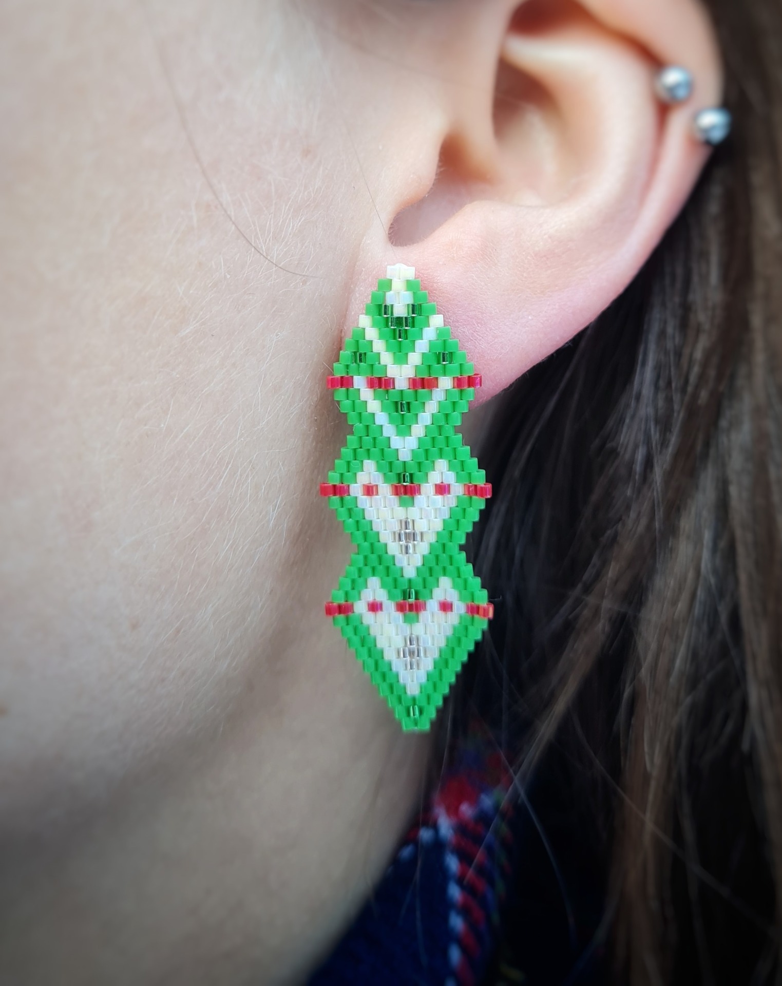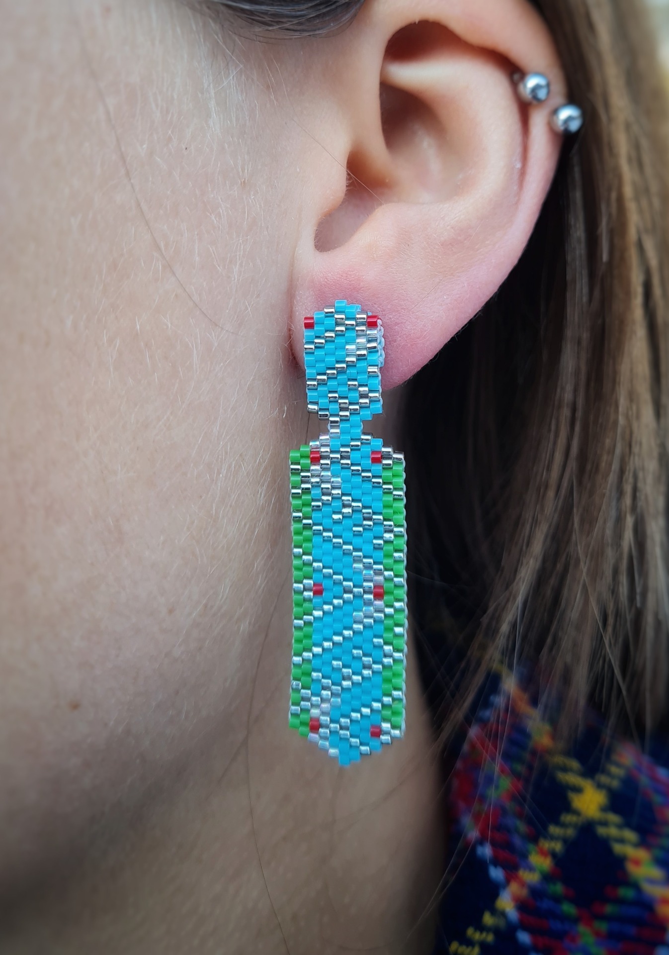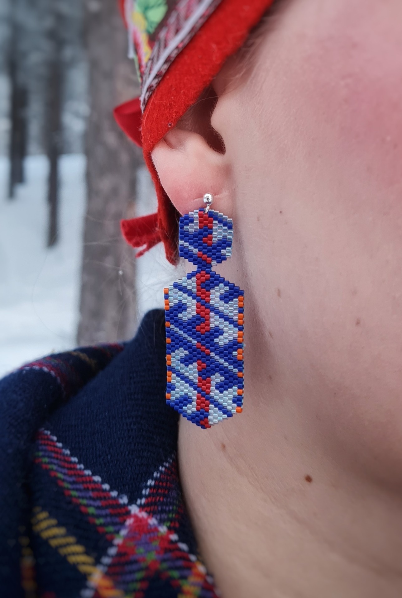 Örhängen vävda med nål i peyote söm av Miyuki pärlor och polyestertråd. Lätta för öronen. Inspirerats av mönsterdetaljer i vävningar.