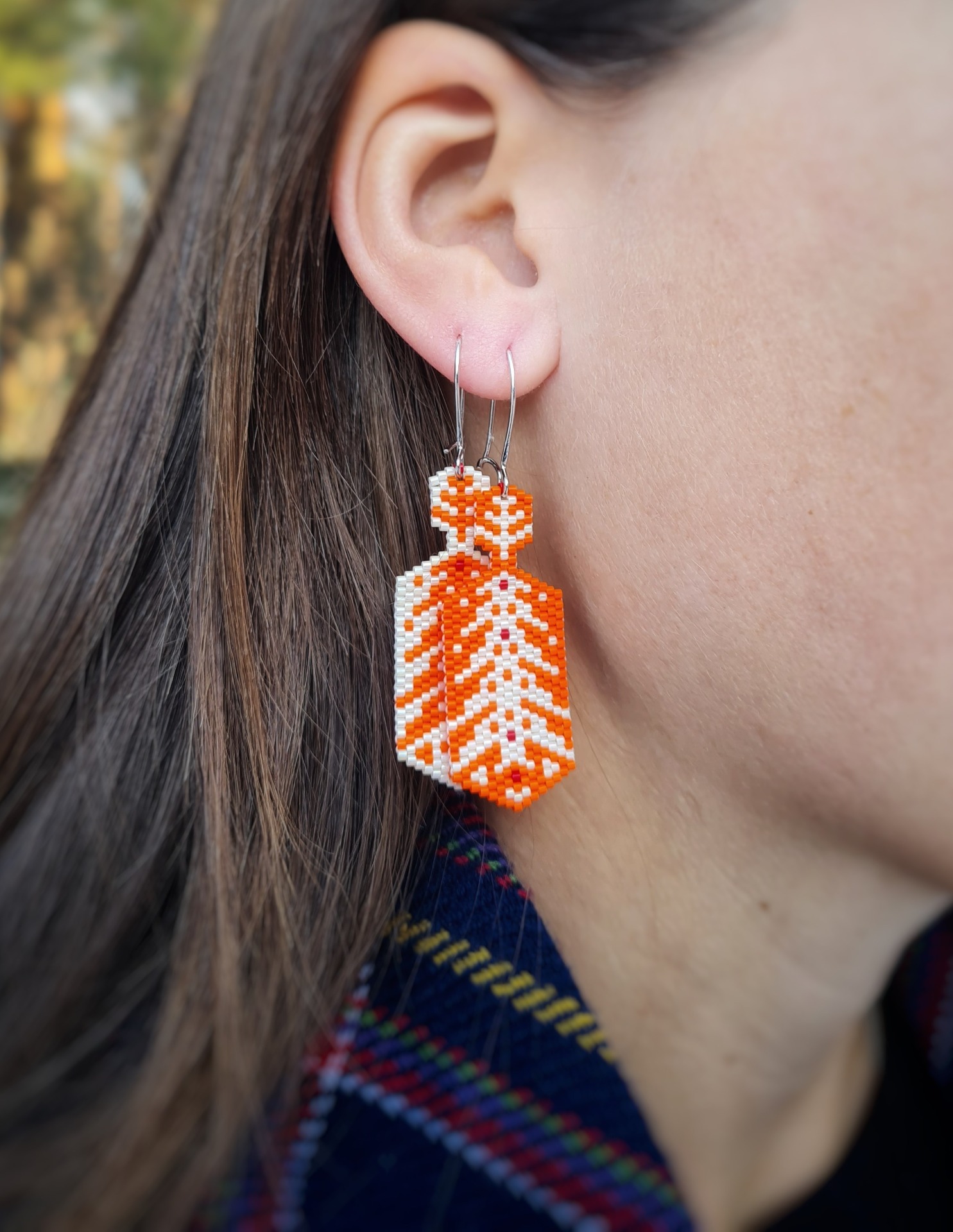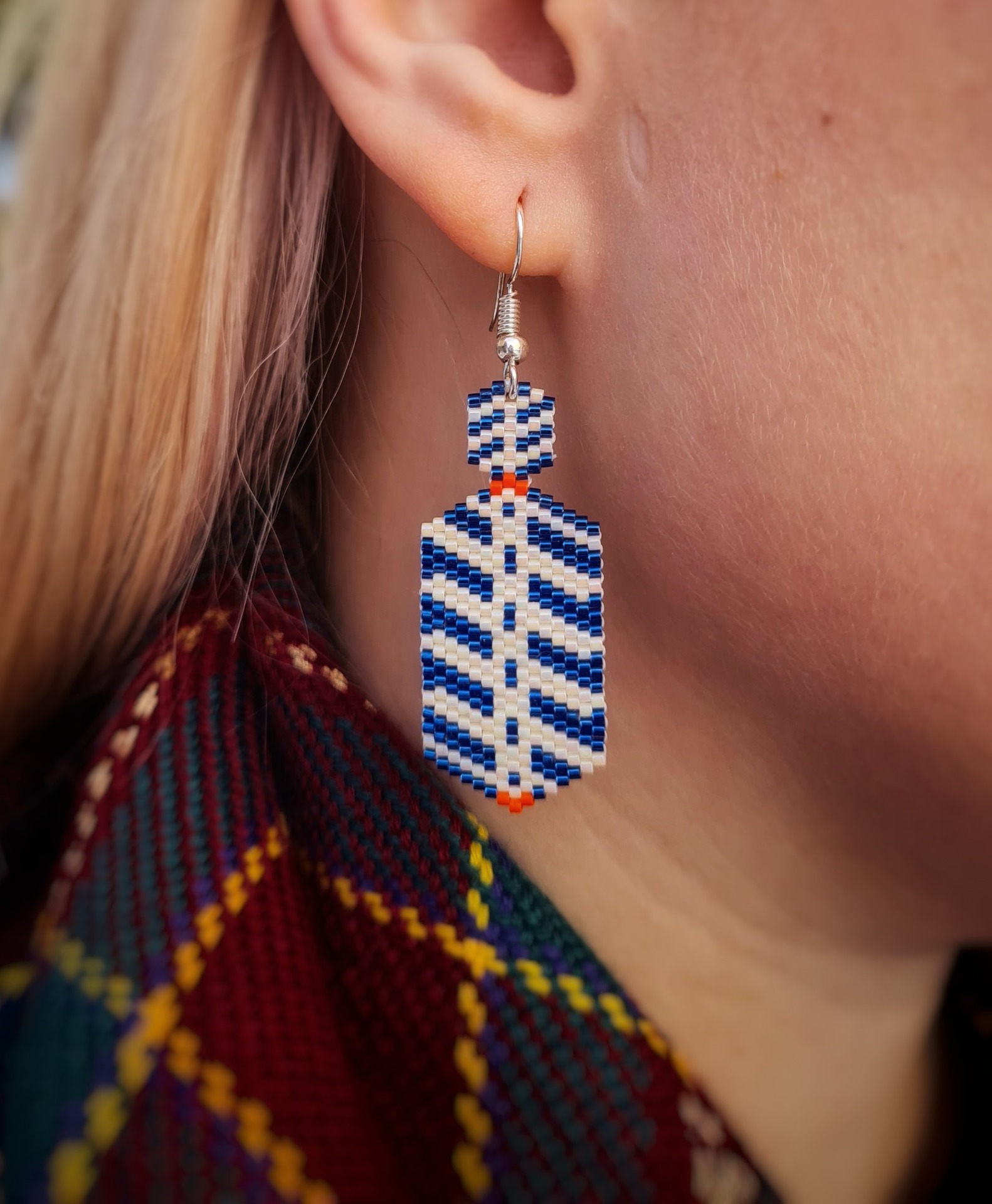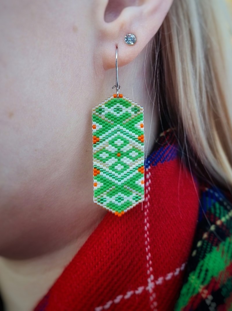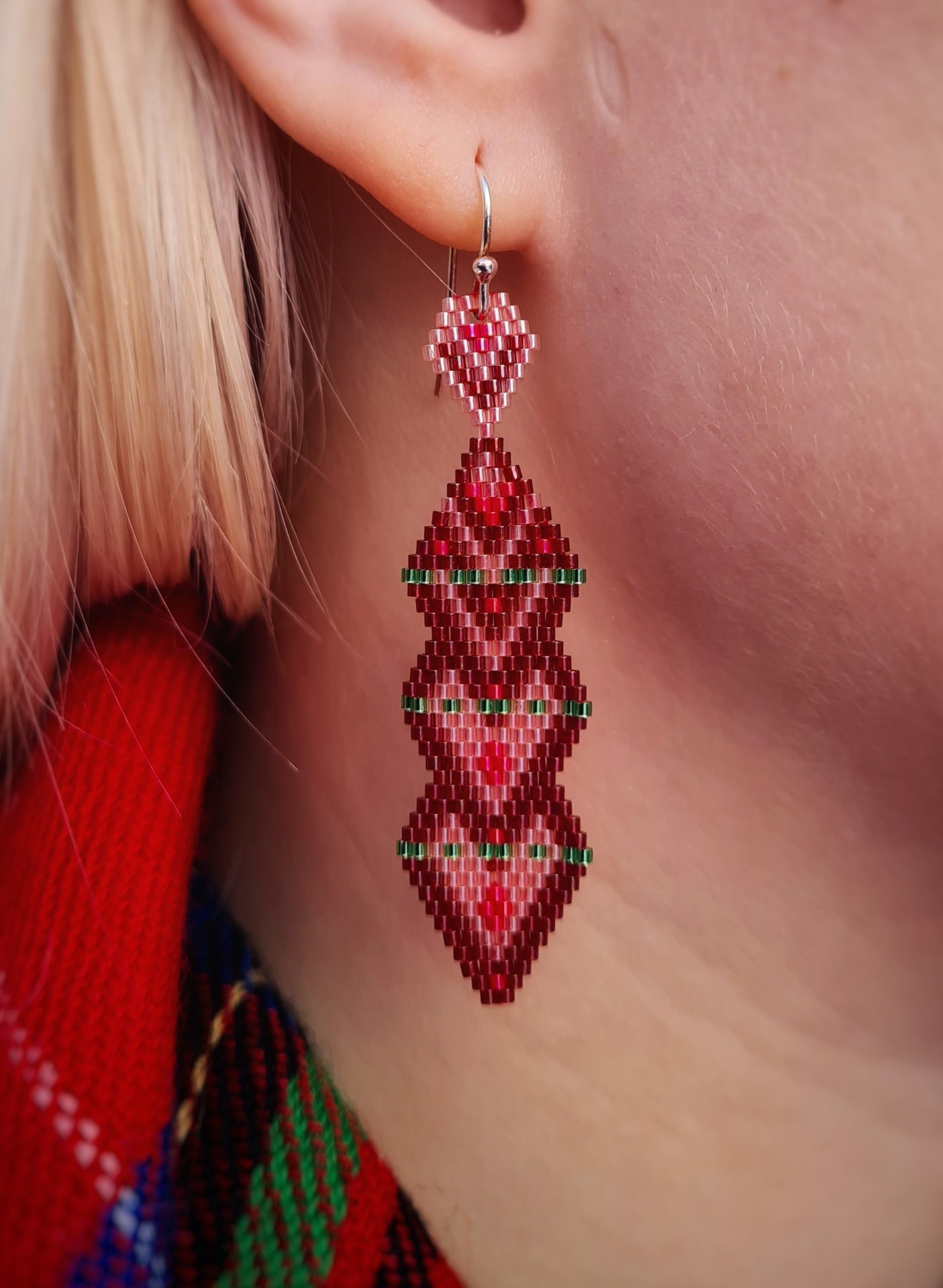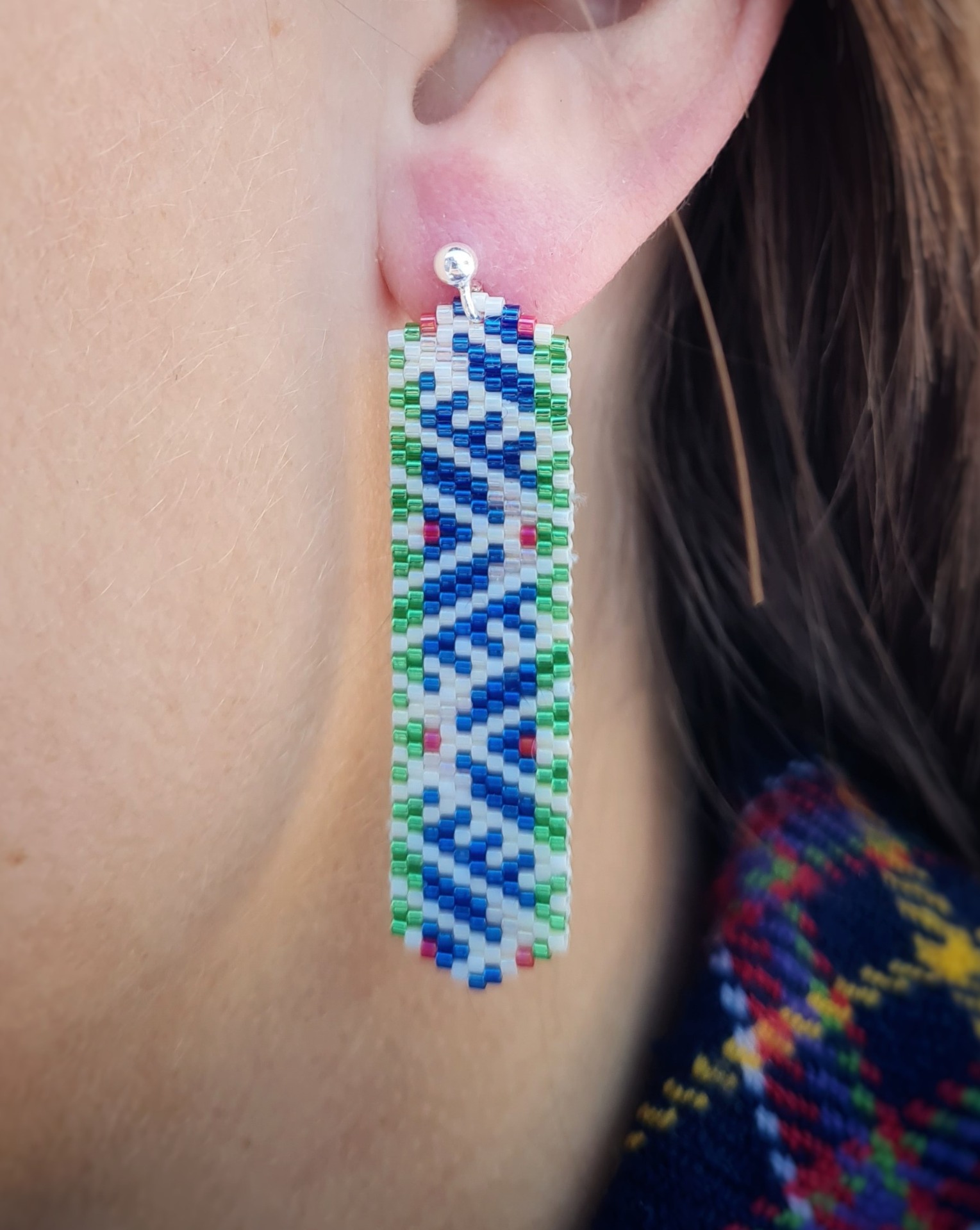 Örhängen vävda med nål i peyote söm av Miyuki pärlor och polyestertråd. Lätta för öronen. Inspirerats av mönsterdetaljer i vävningar.
